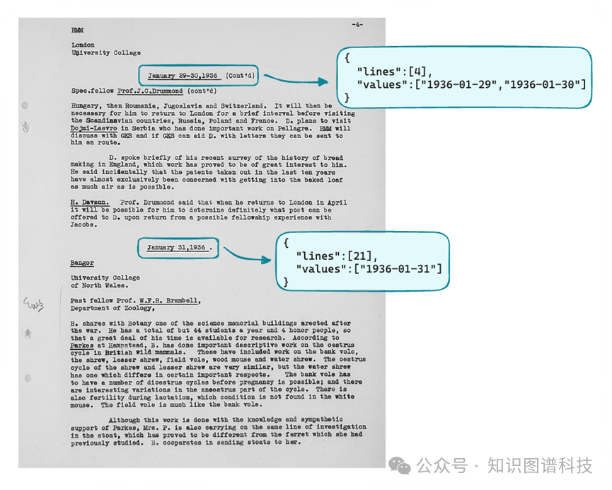 对于日期提取,我们向GPT提供了一个输入列表,其中包含与页面行相对应的枚举行。对于每个页面行,我们在提示中指定要检测与日志条目对应的日期。输出格式是一个JSON列表,其中每个元素包含日期出现的行以及归一化日期或日期范围。