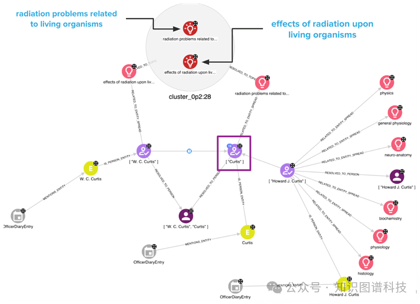 下面提供的图表回答了这个问题。正如你所注意到的那样,Curtis从事与生物体有关的辐射问题研究,而W. C. Curtis从事辐射对生物体的影响研究。这两个字符串代表同一个研究领域,但对于字符串相似性的琐碎算法来说,很难检测到这种相似性。相反,我们处理语义相似性的方法使我们能够正确地将Curtis解析为W. C. Curtis而不是Howard J. Curtis。