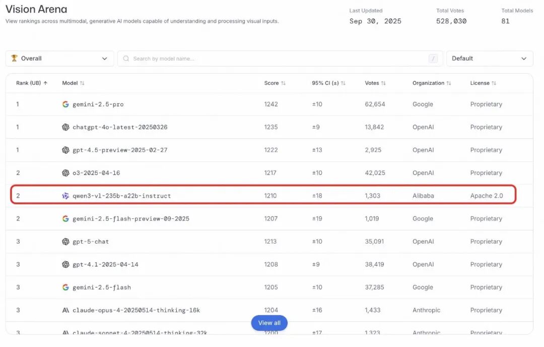 ▲在Vision Arena中Qwen3-VL位居第二(图源:Qwen)