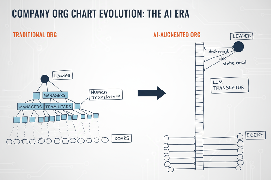 正如下图所展示的,传统组织中密集的管理层级(人类翻译者)正在被扁平化的结构所取代,其中AI充当了信息流动的脊梁,直接连接领导层和执行层。
