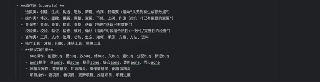 除了“造数”的诉求以外,我们还经常会遇到4类场景: 1.用户首次接触小智,想了解小智的能力。对应意图类型“咨询工具”; 2.工具作者接入工具、管理工具。对应意图类型“操作工具”; 3.用户在联调测试过程中发现了bug,想提交系统。对应意图类型“操作研发项目”; 4.所有其它。对应意图“其它咨询”。 所以,当前意图类型有以上8种。每种意图类型会对应到特定的校验方式、处理方式。例如:“造数”需要校验用户是否明确了环境(预发还是线下);“其它咨询”不需要确认环境,在后续处理流程中也不需要走工具过滤引擎,因为不用传入mcp 工具列表给推理执行模块等等。