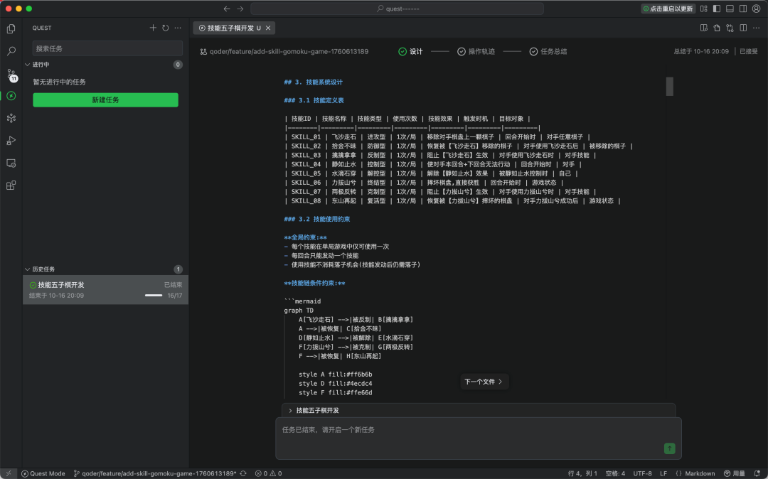 如果你选择远程模式,Qoder 在第二阶段就在云上启动一个沙箱(如下图所示),一个安全的运行环境,Agent 可以在这个隔离环境中自主运行,不影响本地环境。 当本地环境释放出来了,AI 可以工作的时空间就不再受开发者的时间空限制,即使开发者在睡觉,在旅游,在出差,AI 照样可以在理论上算力无限的云上执行任务。 当任务完成后,系统就会进入第三阶段——任务总结。 AI 会自动生成任务报告,包括已完成的代码修改的总结、测试结果与验证结论,以及已更改文件的详细列表。你可以通过查看这些文件以快速评估 AI 生成的代码的质量和完整性。 如果需要继续处理,可以返回第二阶段「轨迹追踪」发送新消息,AI 将从上次停留处继续。 Quest Mode 就有点像“外包项目”,我们把一个功能模块的开发任务写成需求文档,然后交给 Qoder 这位承包商去完成。我们只需在开始前澄清需求,最后验收成果即可,中间可以解放时间去处理其他事情。 那什么项目适合“外包”给 Quest Mode 呢? 两个判断标准。 第一,这个任务目标是否明确?如果目标不明确,那很难生成清晰准确的需求规格说明(Spec),那么 Quest 效果就会大打折扣。 第二,这个任务实施起来是否非常耗时耗力?如果是,那就应该考虑Quest Mode。因为Quest Mode 设计之初就是用来处理这种复杂、长周期开发任务的。 以下这三个栗子,都满足这两个判断标准: 开发一个完整的新功能:例如“开发一个带权限管理的用户中心模块” 大型代码迁移/重构:如“将整个项目从 JavaScript 迁移到 TypeScript” 批量任务:如“为项目中的所有核心函数添加单元测试”