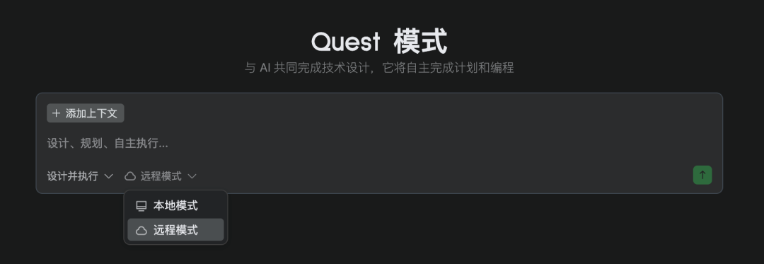 任务执行阶段,就是大家在各种 IDE 中经常看到的执行界面,它会展示 AI 的待办计划、实时输出,进度状态以及任何阻塞项。只不过在 Quest Mode 中叫做「轨迹追踪」。 在这个过程中,你可以随时添加新需求——即使任务正在运行——只需要在聊天框中发送消息,AI 会相应调整计划并继续工作。 其实在进入第一阶段之前,Quest Mode 会让你选择本地模式还是远程模式,前者比较好理解,后者则类似 Cursor 的Background Agent。
