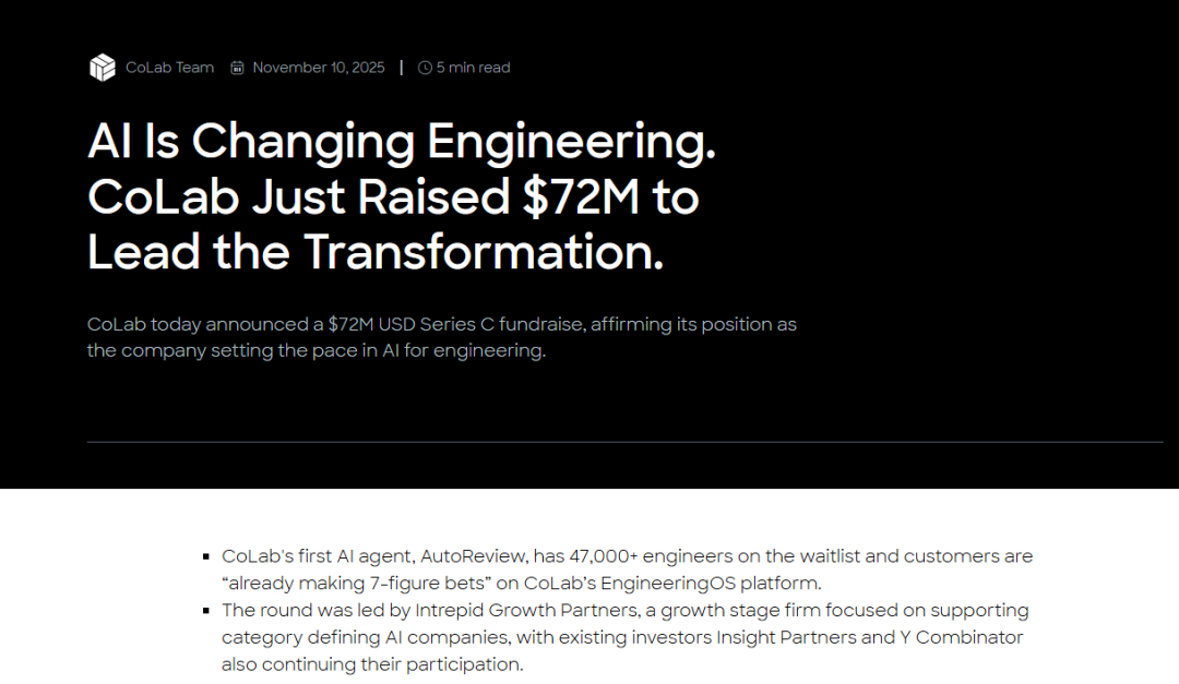 昨天,S朋友分享了一家企业给我,这个月刚它完成了7200万美元C轮融资,YC跟投,发展速度很快。它是一家为工程机械和硬件开发团队打造协作工具的SaaS公司,名叫CoLab,这家成立仅8年的公司,累计融资已超1.3亿美元。 更值得关注的是增长数据。过去三年收入增长超过10倍,2024年B轮时实现了158%的净收入留存率(NRR),C轮披露2025年预计收入再翻三倍。福特、通用电气、江森自控、施耐德这些制造业巨头都在用他们的产品。 01 选对了赛道 CoLab做的事情很具体:帮机械工程师做设计评审。 这个场景听起来小众,但痛点真实。一个汽车零件的设计评审,传统流程可能要数周。工程师们在邮件里来回发图纸,用Excel记录问题,开会时靠PPT展示。效率低,信息散乱,很多问题根本没记录下来。 创始人Adam Keating和Jeremy Andrews都是机械工程师出身。Andrews在特斯拉参与Model 3电池包设计时,单个塑料卡扣的评审就花了8周。Keating在医疗设备公司工作时发现,即便是救命的产品,评审流程依然混乱低效。 2017年两人创立时想法很简单:把设计文件搬到浏览器上,让工程师能直接在3D模型上打标注、讨论问题,所有反馈自动保存、可追溯。 切入点精准。工程设计是高价值场景,决策错误代价高昂。一个设计缺陷可能导致召回、返工、甚至安全事故。而且这个领域的软件工具确实老旧,大多数公司还在用20年前的协作方式。 02 AI不是锦上添花,是核心能力 CoLab真正的护城河不是协作平台本身,而是8年积累的工程决策数据。 平台记录的不只是最终结果,还有完整的讨论过程:为什么这个孔要改位置?为什么壁厚要调整?哪些方案被否决了,原因是什么?这些散落在工程师脑子里的经验,变成了结构化的知识库。 数百万条设计标注,数千万次评审讨论,形成了独特的训练语料。这让CoLab的AI知道的不只是"改了什么",更重要的是"为什么这么改"。 2025年6月,CoLab推出第一个AI代理AutoReview。功能直接:自动检查图纸和模型的错误、不合规范的地方、制造工艺问题。 效果立竿见影。推出后4个月,4.7万名工程师排队试用。用过的工程师评价,"像有个资深师傅在肩膀上看着你"。 这不是简单的规则检查。AI会从历史项目中找相似零件,看之前遇到过什么问题、怎么解决的。它能提醒你,"上次类似的设计在装配时出过问题",然后给出当时的讨论记录和解决方案。 某客户用AutoReview后,BOM成本直接降了50%,设计周期快了一倍。不是因为工程师变聪明了,而是AI帮他们避开了之前踩过的坑。 03 产品逻辑:先积累数据,再释放AI CoLab的产品路径值得琢磨。 前5年专心做协作平台,不急着上AI。让工程师用起来,习惯在上面标注、讨论。体验足够自然,工程师才愿意持续使用,数据才能积累起来。 这是个关键设计。工程师的知识大多在脑子里,文档化意愿低。如果工具用起来麻烦,或者看不到价值,根本不会有人记录。 CoLab的办法是把记录融入日常工作。评审时顺手标注,讨论自动保存,不用额外填表、写文档。工程师获得了更高效的协作工具,公司收获了持续增长的数据资产。 等数据量够了,AI的价值才能真正发挥。AutoReview推出时,背后已经有数百万条专业标注作为训练基础。 这种"先服务后智能"的路径,避免了很多AI创业公司的通病:有模型没数据,或者有数据但不够精准。