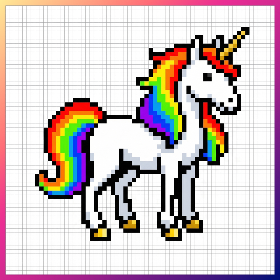 “在这个 64x64 网格图里生成一个独角兽的像素画精灵,使用高对比度配色。”