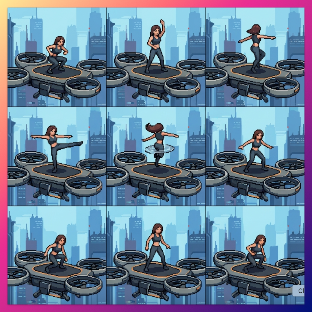 “一个女人在无人机上做后空翻的逐帧动画图,3x3 网格,逐帧动画。严格按参考图结构生成。”