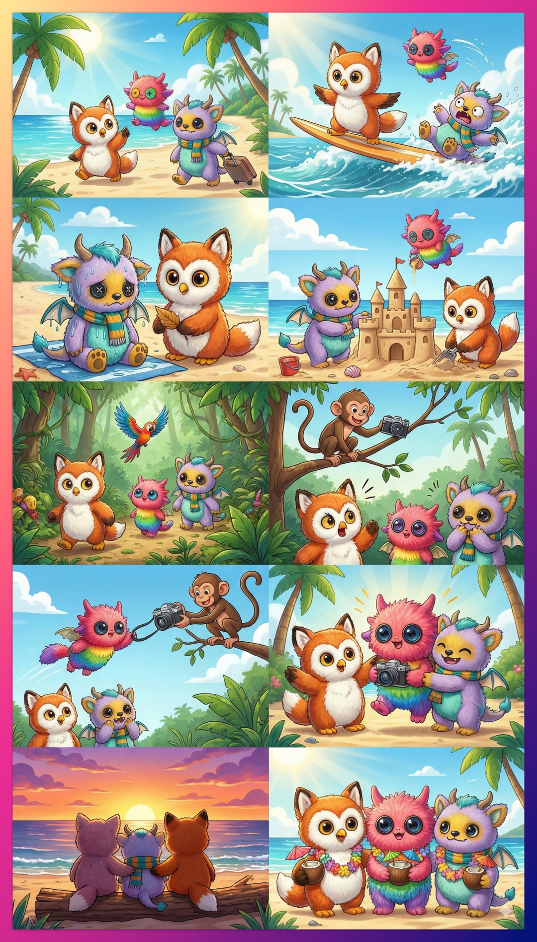 “用这 3 个毛绒朋友创作一个有趣的 10 集故事,它们要去热带度假。故事全程要扣人心弦,有情绪高潮和低谷,最后是温馨结局。3 个角色的服装和身份在所有图中保持一致,但表情和角度要有变化。确保每张图中每个角色只出现一次。”