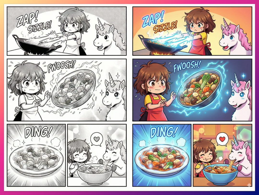 “给这张漫画页上色。使用鲜艳的动漫风格配色。能量光束的光效用发光的霓虹蓝,角色服装按官方配色。”