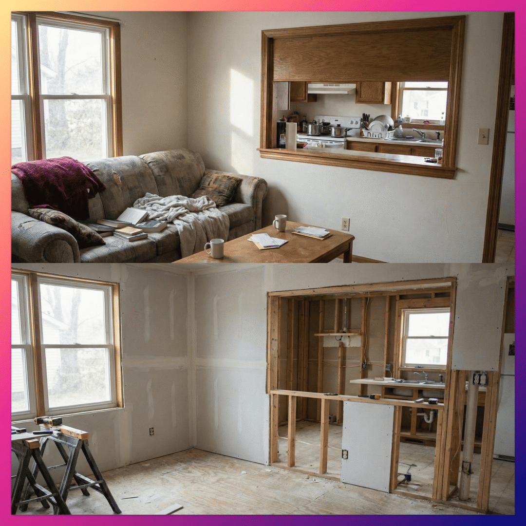 “分析这张图,生成一张‘施工前’的图片,展示框架结构和未完工的石膏板。”