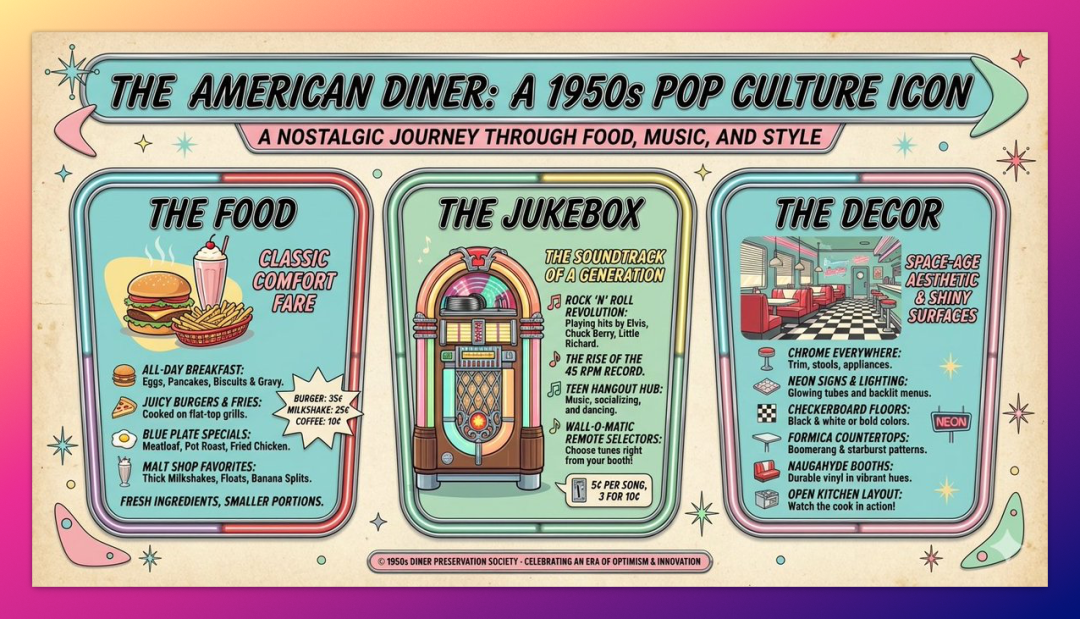 “制作一张 1950 年代复古风格的信息图,主题是美国餐车的历史。分成‘食物’、‘点唱机’和‘装饰’三个板块。所有文字都要清晰可读,风格要符合那个年代。”