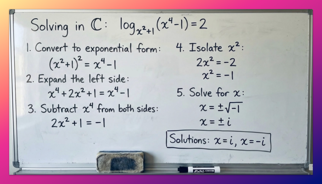 “在白板上解这道方程:log_{x²+1}(x⁴-1)=2。清晰展示步骤。”