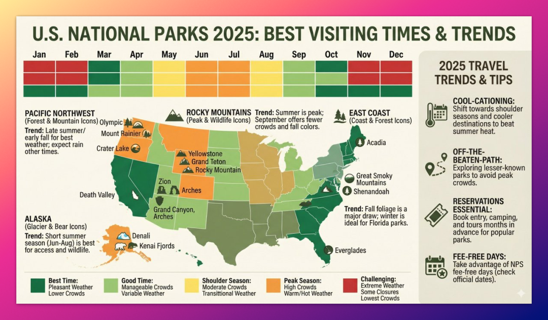 “根据当前旅游趋势,生成一张 2025 年美国国家公园最佳游览时间的信息图。”