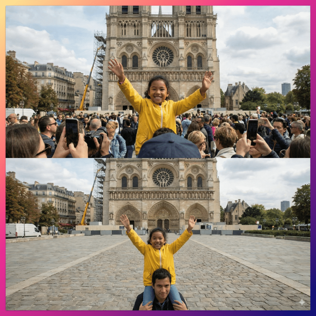 “把这张照片背景里的游客都删掉,用符合周围环境的纹理(鹅卵石和店铺门面)自然填充。”