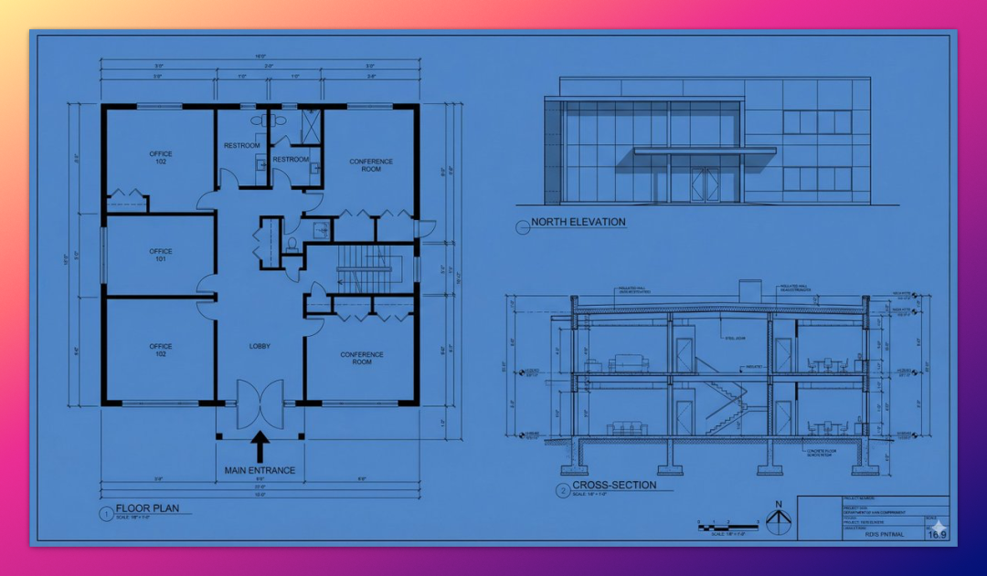 “创建一张正交投影的建筑蓝图,包含平面图、立面图和剖面图。用技术建筑字体清晰标注‘北立面’和‘主入口’。16:9 格式。”