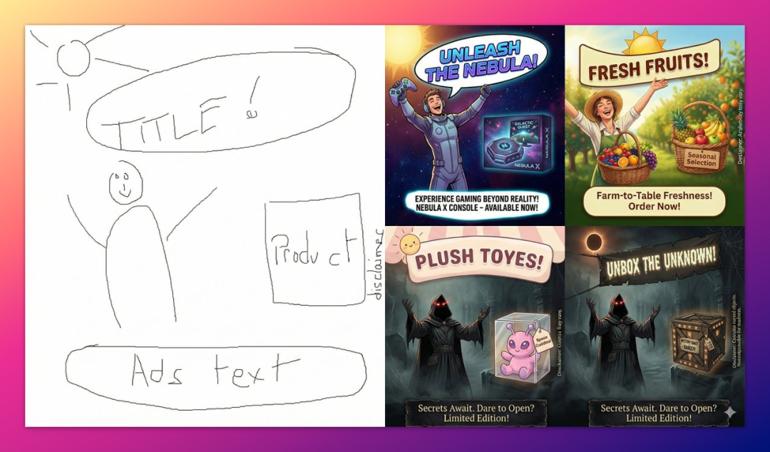 “根据这张草图,生成一张 XX 产品的广告图。”