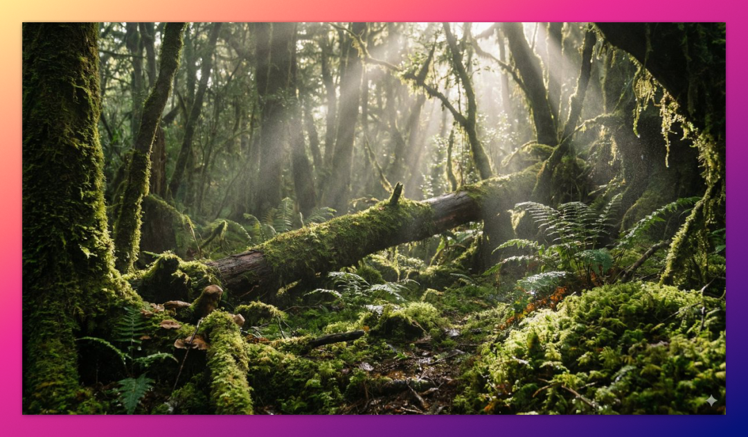 “创作一张令人屏息的苔藓森林地面环境图。光影复杂、纹理精细,每一根苔藓丝和每一束光线都要像素级清晰。适合作为 4K 壁纸。”