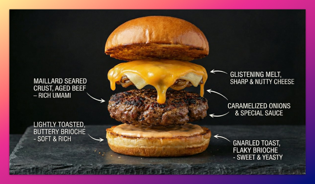 “创建一张超写实的美食汉堡解构信息图,展示烤过的布里欧面包纹理、肉饼煎焦外壳、芝士融化光泽。给每一层标注风味描述。”