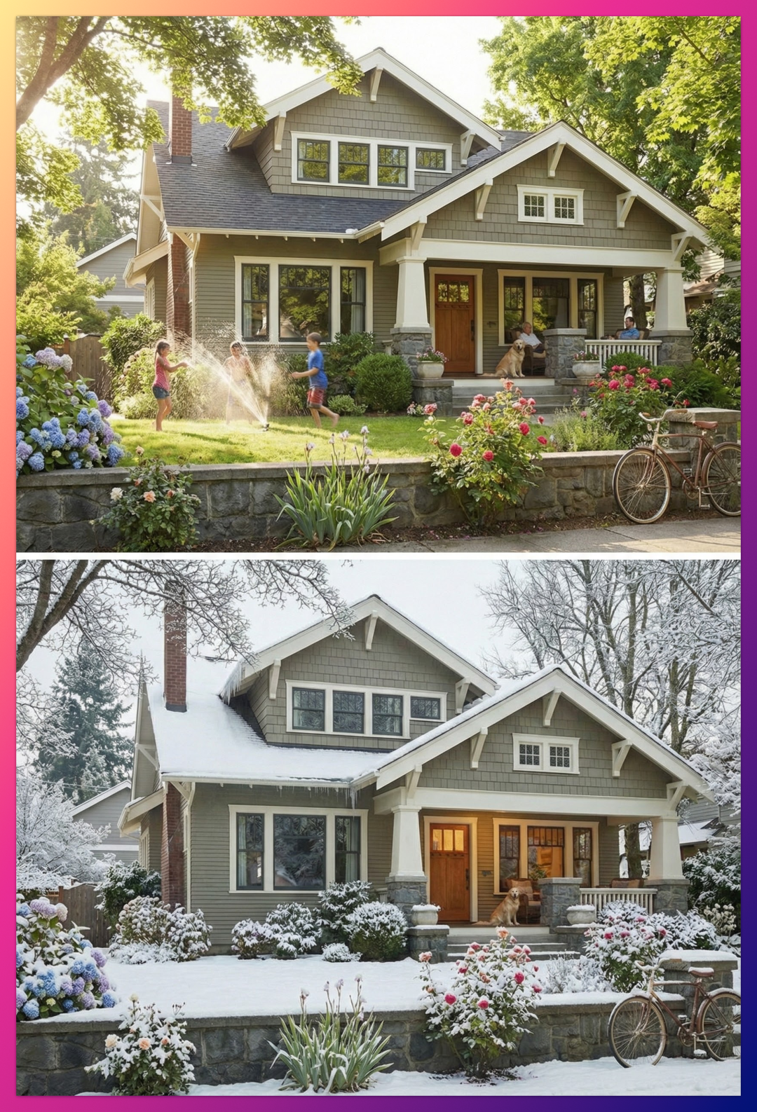 “把这个场景变成冬天。房子的建筑结构保持不变,但在屋顶和院子里加上雪,光线调整成寒冷阴沉的下午。”