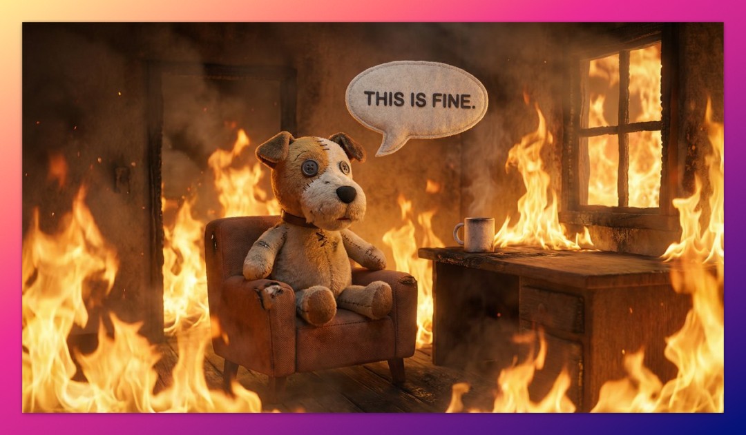 “把‘This is Fine’那只狗的梗图变成照片级 3D 渲染。构图不变,但狗变成毛绒玩具质感,火焰改为真实火焰效果。”