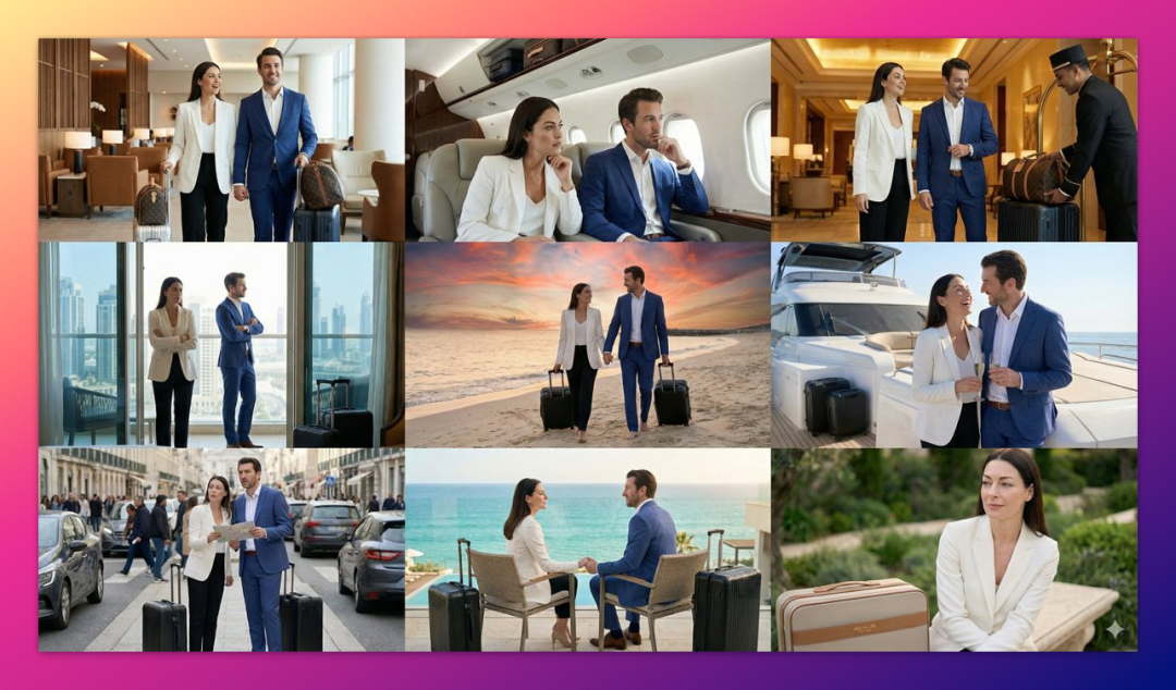 “创作一个引人入胜的 9 集故事,画面中有一男一女,是一支获奖级别的奢侈箱包广告。故事要有情绪起伏,最后一张是女主角与 Logo 的优雅定格。风格统一,每张为 16:9 横版。”