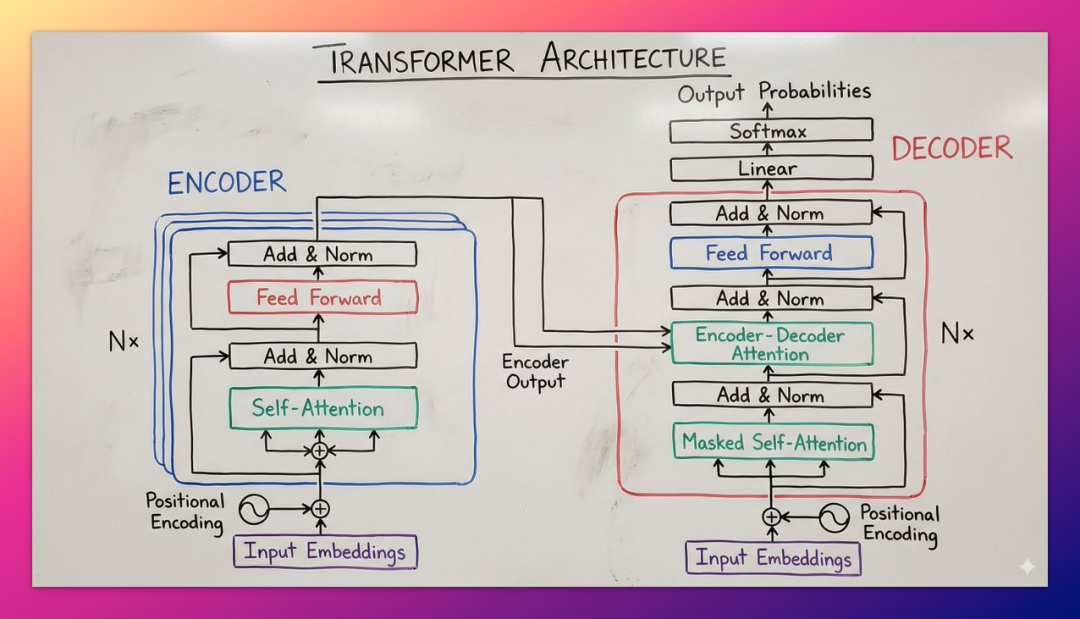“把‘Transformer 神经网络架构’的概念,画成一张适合大学课堂的手绘白板图。用不同颜色的马克笔区分编码器和解码器模块,清晰标注‘自注意力’和‘前馈网络’。”