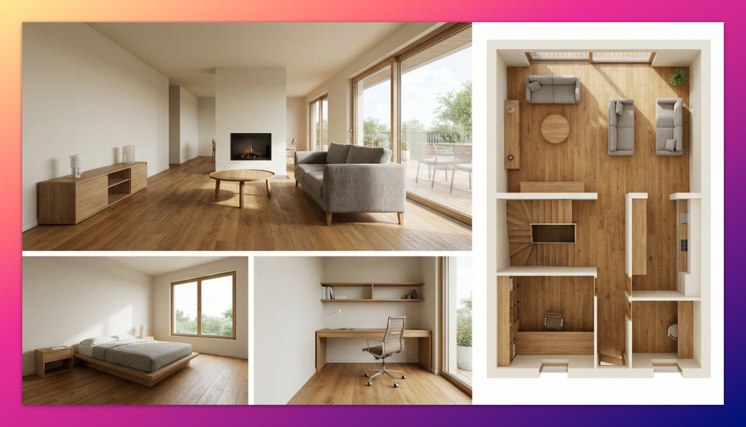 “根据上传的 2D 户型图,生成一张专业的室内设计展示板。布局:一张大的主图在顶部(客厅的广角透视),下面三张小图(主卧、书房、3D 俯视户型图)。风格:现代极简,暖橡木地板,米白色墙面。画质:照片级渲染,柔和自然光。”