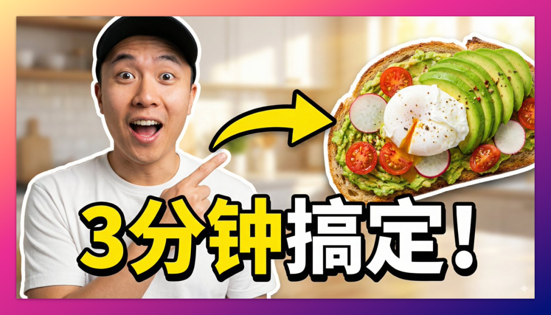 “用图 1 中的人物设计一张病毒式视频缩略图。面部一致性:保持和图 1 完全相同的面部特征,但表情改成兴奋和惊讶。动作:人物放在左侧,手指指向右侧。主体:右侧放一张诱人的牛油果吐司高清图。图形:加一个粗黄色箭头,连接手指和吐司。文字:中间叠加大号流行风格文字‘3 分钟搞定!’白色粗描边加投影。背景:模糊的明亮厨房。高饱和度和对比度。”