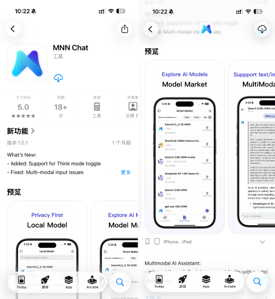 iOS用户 在 App Store(美区)搜索“MNN Chat”。 (可选)从 Github 下载源码,使用Xcode编译安装。