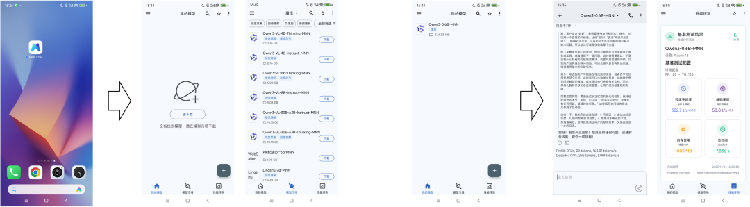 1、进入模型市场:打开 APP,在“模型市场”中,你可以看到MNN官方支持的各类模型。 2、下载Qwen模型:找到你感兴趣的 Qwen 模型(如 Qwen3-0.6B-MNN),点击下载。 3、开始对话:下载完成后,进入对话界面,即可开始与本地运行的 Qwen 模型进行交互!你甚至可以尝试图片问答等多模态功能。