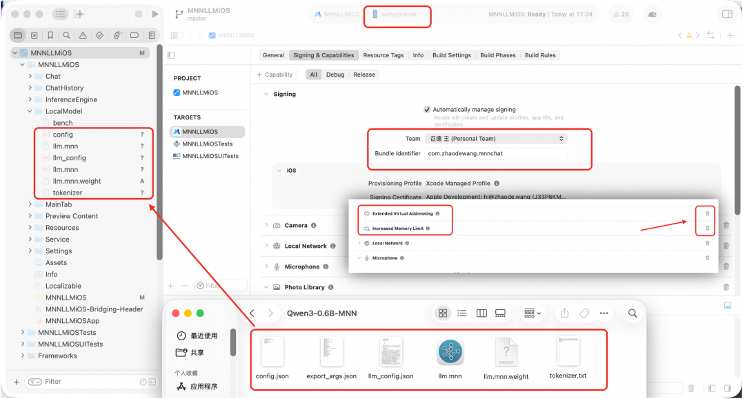💡提示:在Signing & Capabilities 界面中,Team栏选择你的账号;修改一个可用的Bundle Identifier。 💡注意:如果你的账号不是苹果开发者账号,请删除该界面下面的 Extended Virtual Addressing 和 Increased Memory Limit 两个权限,否则无法编译。 完成以上步骤后,再次运行 APP,它就能在内置的资源目录中找到并加载 Qwen 模型了。