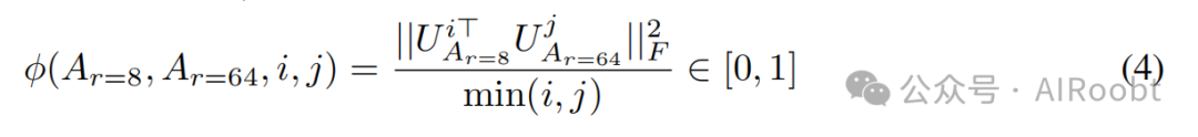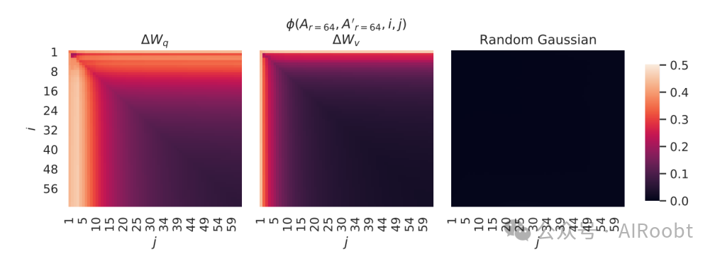 (注释:这张图展示了在不同的秩(r)下,适应矩阵(∆W)的列向量之间的子空间相似性。具体来说,它比较了秩为8(Ar=8)和秩为64(Ar=64)的适应矩阵∆Wq(查询权重更新)和∆Wv(值权重更新)的列向量。