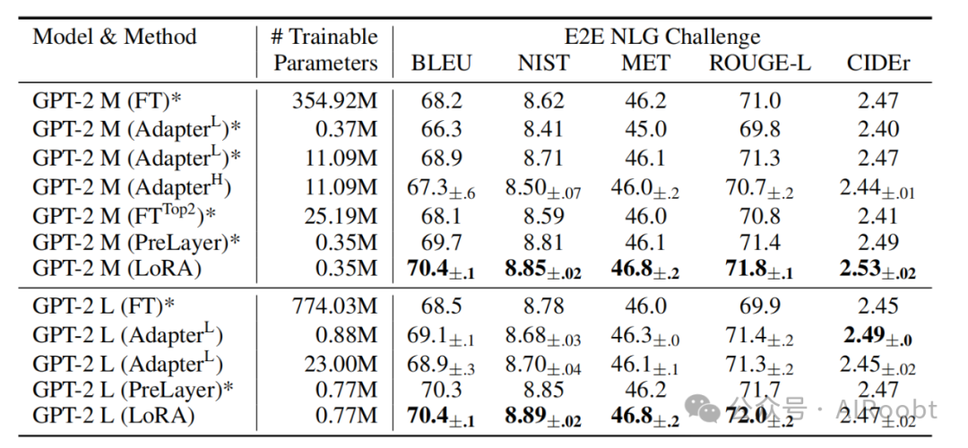 表格中的行代表不同的GPT-2模型版本,包括中型(M)和大型(L),以及它们在不同适应方法下的性能。例如,GPT-2 M (FT)* 表示GPT-2中型模型的全微调版本,它有354.92M(百万)个可训练参数,并在各项指标上取得了一定的分数。