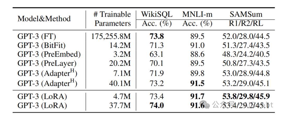 表格中的行代表不同的适应方法及其在三个任务上的性能表现。例如,GPT-3 (FT) 表示GPT-3模型的全微调版本,它有175,255.8M(约175亿)个可训练参数,并在WikiSQL、MNLI-m和SAMSum任务上取得了一定的准确率和Rouge分数。