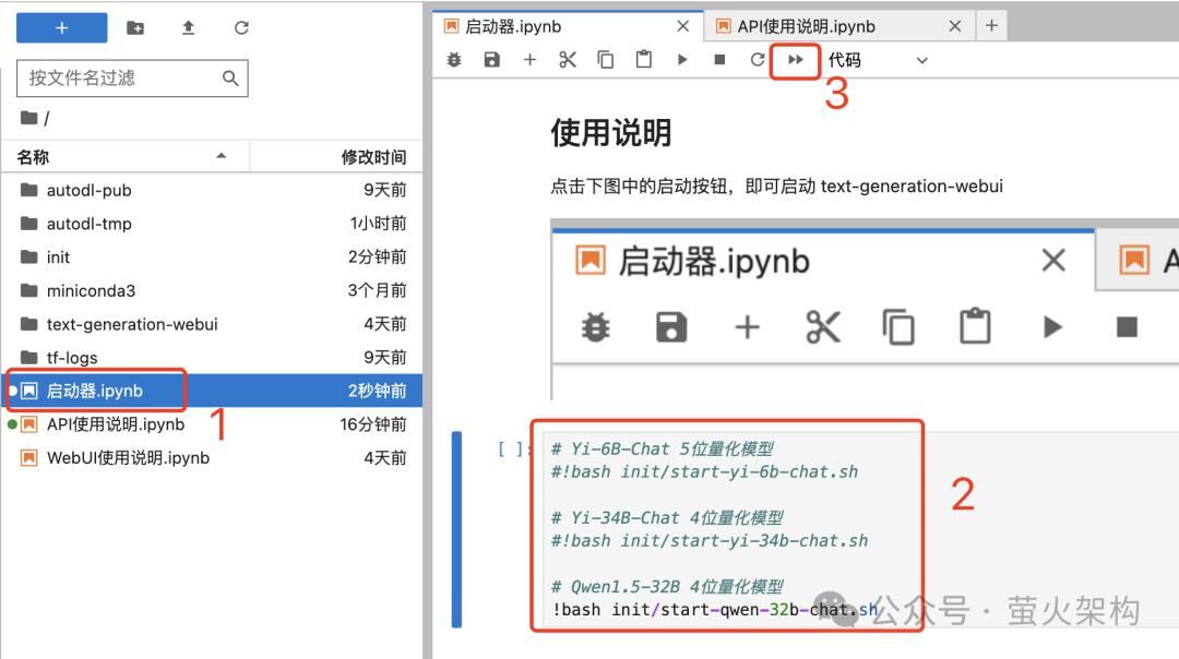 在JupyterLab页面中打开“启动器”,这个镜像会安装3个大模型,默认启动的是Qwen-32B,这实际上是一个4bit的量化模型,只需要24G的显存就能跑起来,但是相比原版的32B性能略有下降,不过也够用了。原版的32B需要数倍的显存,AutoDL上跑起来成本太高。