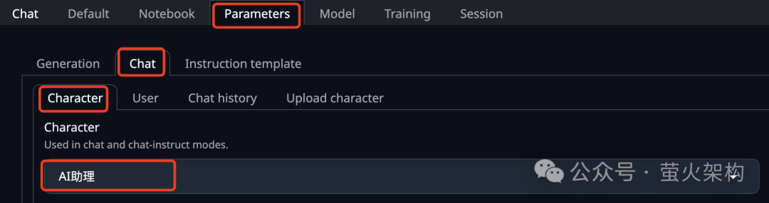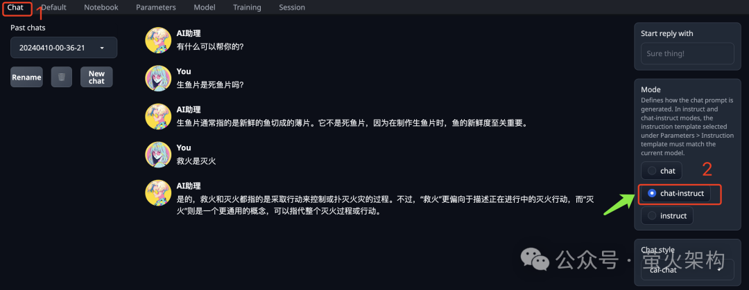 在聊天(Chat)页签的右侧,有一个“Mode”,定义了大模型处理提示词的模式,需要选择“chat-instruct”。