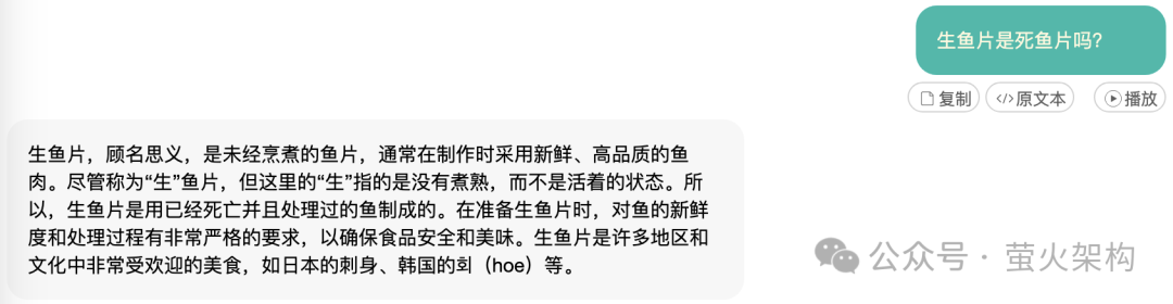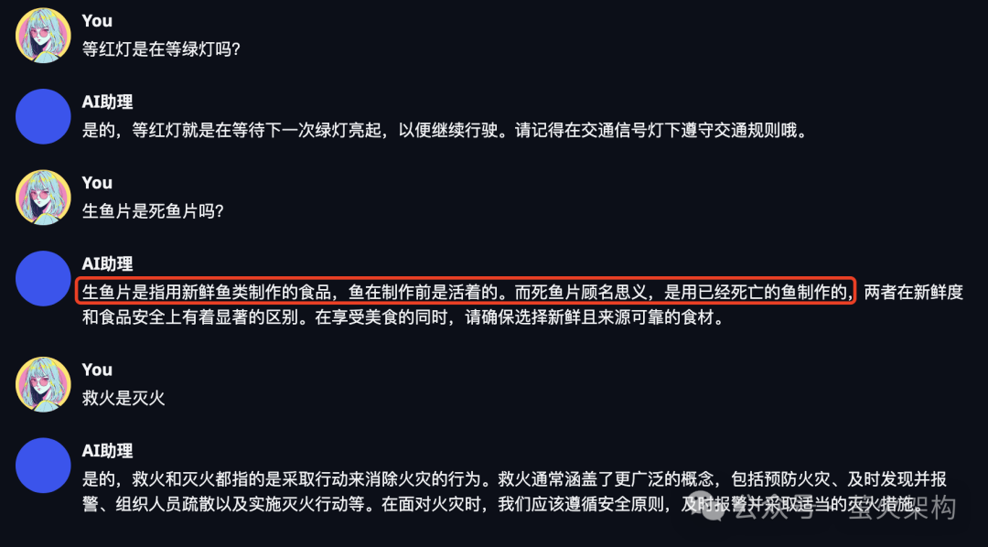 然后我们就可以和它聊天了,如下是弱智吧的3个经典问题。可以看到,只有“生鱼片是死鱼片”这个问题回答的不太好,大模型好像不太能理解生鱼片的生到底是什么意思。