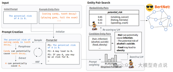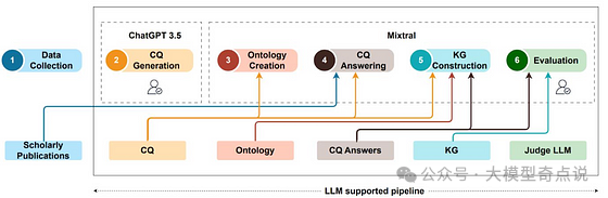 (a) 仅靠LLM可能还不够 (b) 通过知识图谱,可以增强LLM的推理过程2019年提出的一个早期方法是COMET(或COMmonsEnse Transformers),它使用了一个微调过的生成型LLM,这里是GPT,通过在给定头实体和关系的情况下生成尾实体来构建知识图谱。在下图中的“种子”和“关系”给出后,COMET生成了“完成”响应,然后由人类评估这些响应的合理性。这些种子-关系-完成三元组可以用来形成知识图谱。例如,“piece”和“machine”可以通过“PartOf”关系形成两个相连的节点。 “完成”列中的响应由 COMET 生成,给定“seed”和“relation”为了避开与手动数据注释相关的努力和成本,专门针对服务领域构建了一个名为BEAR的知识图谱,使用ChatGPT进行开发。为此,创建了一个特定于该领域的本体,它作为知识图谱的基础,并确定了稍后应该填充到知识图谱中的概念和特征。然后提示ChatGPT从非结构化文本数据中提取相关内容和关系,如下图所示。自动提取的信息随后被纳入知识图谱中以构建它。ChatGPT用于从BEAR模型中的文本数据中提取信息Kommineni等人最近再次提出使用ChatGPT作为信息提取器,在他们的知识图谱构建方法中使用ChatGPT-3.5,并在两个阶段由人类领域专家验证结果,如下图所示。这种方法与之前的方法的区别在于,LLMs在这里扮演了更积极的角色。从特定数据集开始,提示ChatGPT生成能力问题(CQs),这些问题是对数据的抽象级问题。通过提示ChatGPT从CQs中提取概念和关系来创建一个本体。从数据中检索CQs的答案并交给ChatGPT,指示其提取关键实体、关系和概念,并将它们映射到本体上以构建知识图谱。 本文讨论的最后一个方法旨在直接从LLMs本身提取信息。Shibo Hao等人认识到,在LLMs的初始训练中存储了大量的知识,这些知识可以被利用。下图显示了获取LLM知识的步骤。该过程从初始提示和少至两个示例实体对开始。采用文本释义模型来对提示进行释义,并从原始提示中派生出修改后的提示。随后,在LLM中搜索与这组提示相对应的实体对。使用搜索和重新评分的方法,提取最相关的对以形成知识图谱,其中对中的实体作为节点,提示作为关系。这种方法使得生成的知识图谱具有更好的关系质量,因为派生的关系具有传统构建的知识图谱中未见的几个特点:- 关系可能很复杂,例如,“A 有能力,但不擅长 B”。