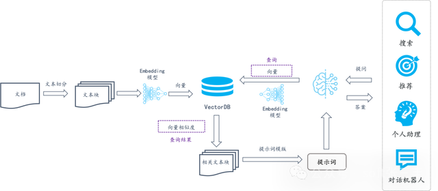 在很长一段时间内,RAG 在行业的代名词都叫知识库,上述的应用架构,不仅带火了向量数据库,也带火了以LangChain,LlamaIndex 为代表的中间件,它们负责处理上图中各个箭头背后的工作流。具体包括: