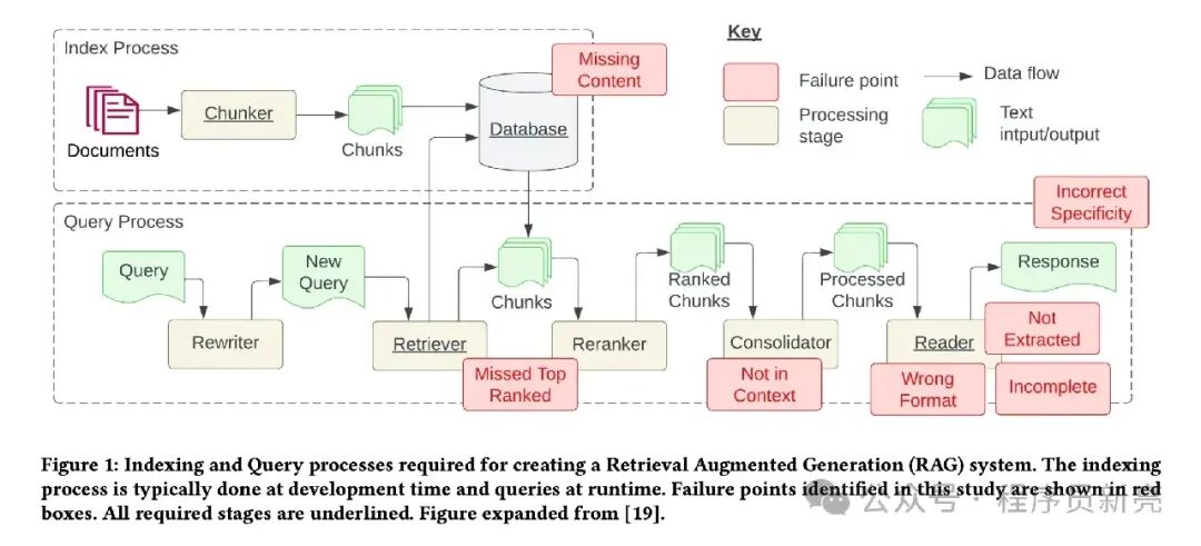 在介绍 RAG 架构的细节之前,我先给大家分享一篇最新的研究报告,它揭示了构建 RAG 系统时常遇到的七大难题。这篇研究报告基于三个不同领域的案例研究,分析了 RAG 系统在实际应用中的表现和问题。