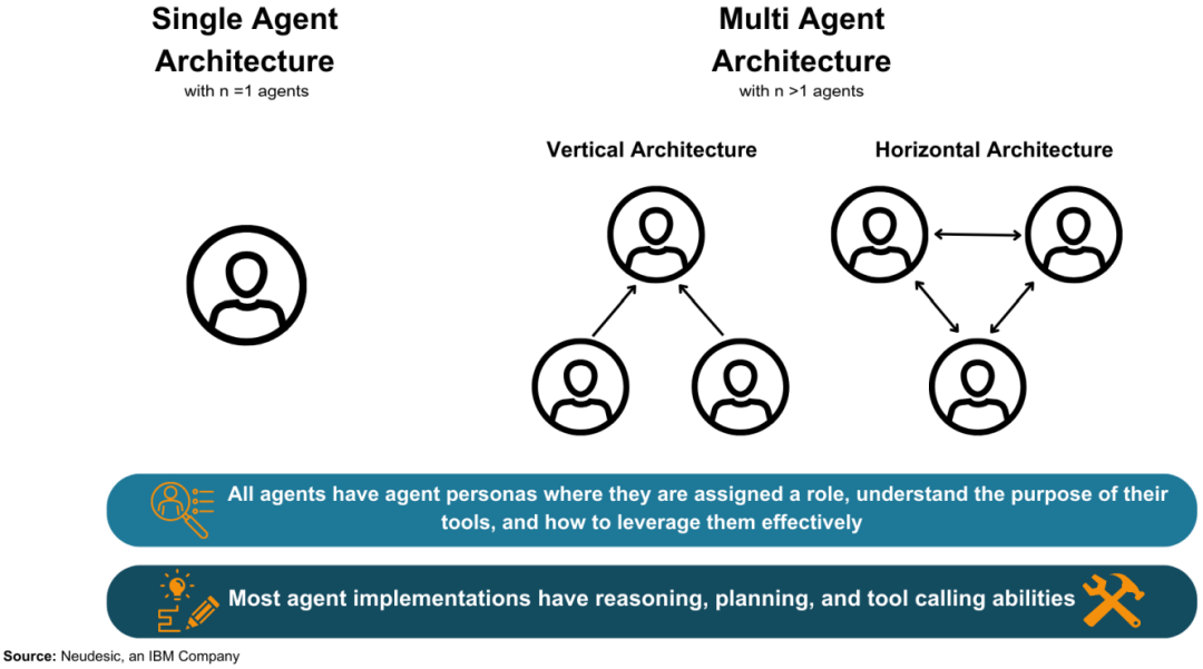 自ChatGPT推出以来,许多第一波生成性AI应用已成为使用检索增强生成(RAG)模式在文档语料库上进行聊天的变种。虽然有很多工作在使RAG系统更加健壮,但不同的团队开始构建下一代AI应用的外观,集中在一个共同的主题上:智能体(Agent)。与用户在开放式文本字段中输入并无需额外输入即可获得结果的大型语言模型的零次提示不同,智能体允许更复杂的交互和编排。特别是,智能体系统具有规划、循环、反思和其他控制结构的概念,这些结构充分利用了模型固有的推理能力来端到端完成任务。结合使用工具、插件和函数调用的能力,智能体被赋予了执行更通用工作的能力。当问题定义明确且不需要来自其他智能体角色或用户的反馈时,单智能体架构表现出色;而当需要协作和多条不同的执行路径时,多智能体架构更倾向于蓬勃发展。 AI智能体被定义为能够规划和采取行动以在多轮迭代中执行目标的语言模型驱动实体。智能体架构可以由单个智能体或多个协同工作解决问题的智能体组成。图1:单智能体和多智能体架构及其底层特性和能力的可视化展示。
