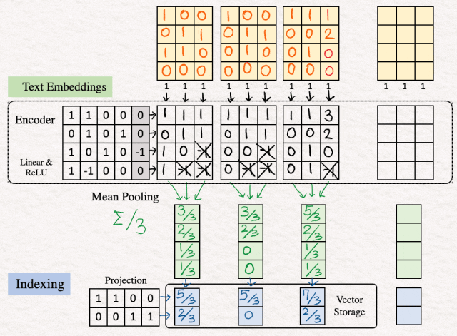 [4]索引:下一步涉及减少文本嵌入向量的维度,这是在投影矩阵的帮助下完成的。该投影矩阵可以是随机的。这里的想法是获得一个简短的表示,这将允许更快的比较和搜索。结果保存在存储器中。
