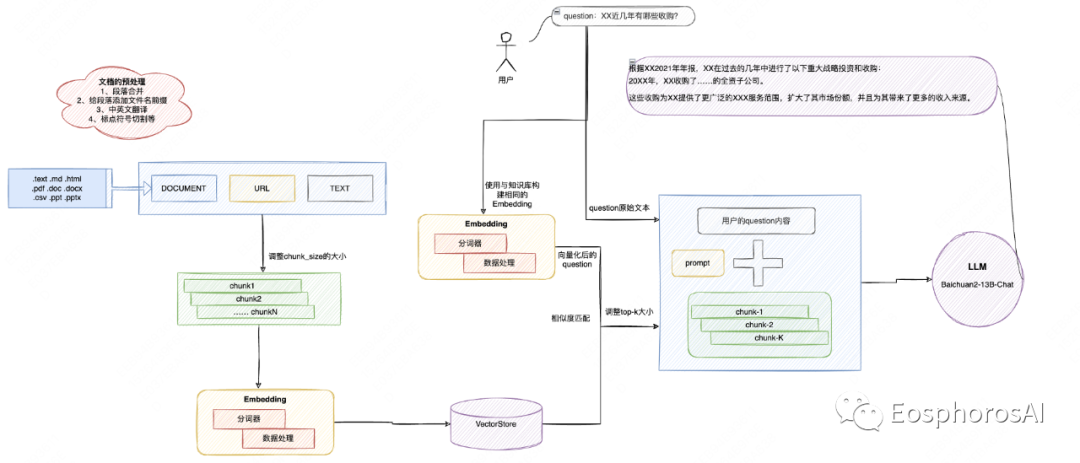 文档的预处理 -> 文档切割 -> Embedding 存储到向量数据库 -> 用户提问 -> 将问题用同样引擎做 Embedding -> 问题向量化 -> 到知识库所在到向量数据库中进行相似的匹配 ->召回得分最高的 k 个 Chunks-> 用户原始提问文本+用户的 prompt + k 个 Chunks 三者输入到本地大模型(LLM) -> 返回给用户问题的回答。