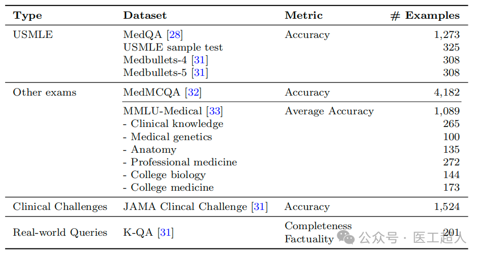 基准数据集和使用的评估指标的统计。“# Examples”:每个数据集的测试示例数量。K-QA 数据集需要自由格式的响应作为答案,而其他数据集由多项选择 QA 问题组成,必须从给定的选项中选择正确的答案 讨论与展望 Meerkat-7B的成功展示了通过学习教科书中的推理路径来提升小型开源模型在复杂医学问题上的性能的潜力。虽然在详尽性方面表现出色,但Meerkat-7B在事实性方面相比于大型模型如GPT-3.5和GPT-4还有提升空间。未来研究将探索进一步提升小型模型可靠性的方法,包括开发能够有效记忆广泛医学知识或采用检索增强方法的策略。未来研究组将公开Meerkat-7B的模型权重和训练数据,包括CoT数据和新的MedBooks-CoT-18数据集,为医学AI领域的研究和应用提供支持。