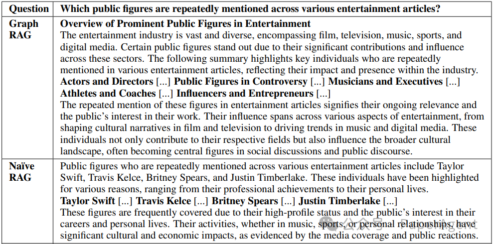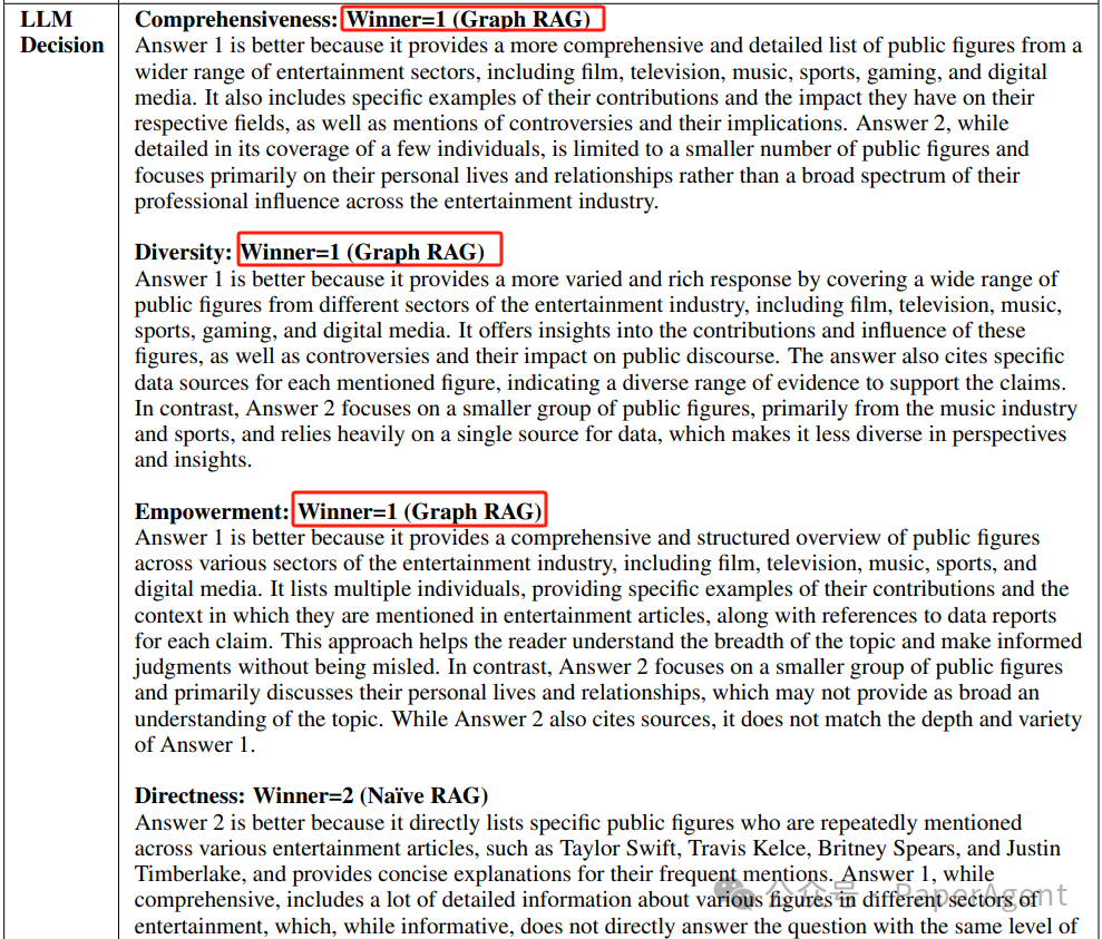 新闻文章数据集的示例问题,以及由Graph RAG(C2级别)和朴素RAG生成的答案,还有由大型语言模型(LLM)生成的评估。Graph RAG答案更加丰富和多样