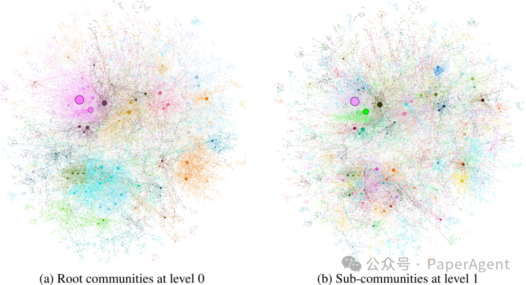 使用Leiden算法检测到的图社区,该算法应用于索引的MultiHop-RAG数据集。圆圈代表实体节点,其大小与它们的度数成比例。节点布局是通过OpenORD和Force Atlas 2完成的。节点颜色代表实体社区,显示在两个层次的层次聚类中:(a) 第0层,对应于具有最大模块化的层次划分;以及 (b) 第1层,它揭示了这些根级别社区内的内部结构。