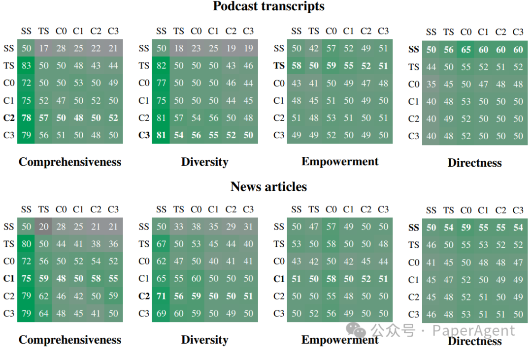 在两个数据集、四个指标和每次比较125个问题上的(行条件)相对于(列条件)的一对一胜率百分比(每个问题重复五次并计算平均值)。每个数据集和指标的总体胜出者以粗体显示。自我胜率没有计算,但作为参考显示为预期的50%。所有Graph RAG条件在全面性和多样性方面都优于朴素RAG。条件C1-C3在答案的全面性和多样性方面也比TS(没有图索引的全局文本摘要)略有提高。