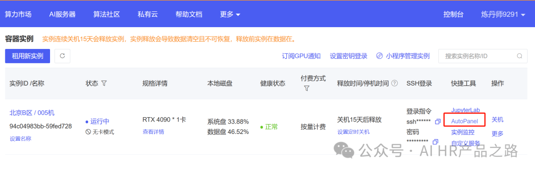 • 租显卡:租RTX 4090 - 24G内存。模型训练1000条数据才20分钟,超快;价格约2元/小时。