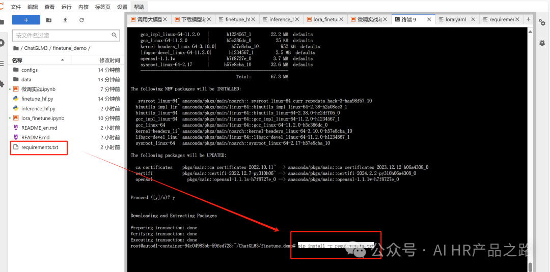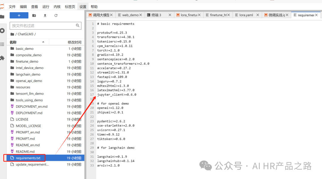 *注意要在ChatGLM3/finetune_demo这个目录下进行下载依赖工具包,不然就下错啦~ 不然可能下到其他工具的依赖包了。