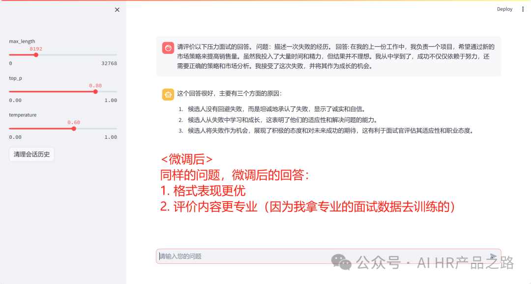 比如GPT 3.5的相当于大学生,微调后相当于读了个HR的硕士,他在HR场景下能力更强,懂得更多,回答得更专业。