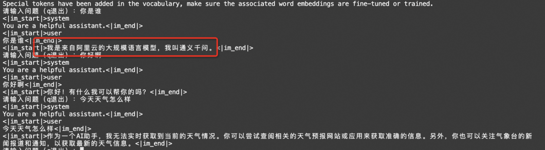 上面的代码首先从本地模型文件夹中加载了模型和分词器,然后我们在一个循环中接收用户输入,并将输入处理后通过大模型进行内容生成。我们可以通过python运行上面的文件,运行后,就可以测试了,就测试运行效果如下: